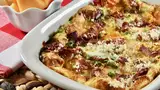 - Step 4:Layer toasted bread cubes in a 1 1/2-quart baking pan. Sprinkle 1/4 cup Swiss cheese, 1/4 cup Cheddar cheese, 1/2 the bacon, and 2 green onions on top of the bread. Shake to settle the toppings into the bread.